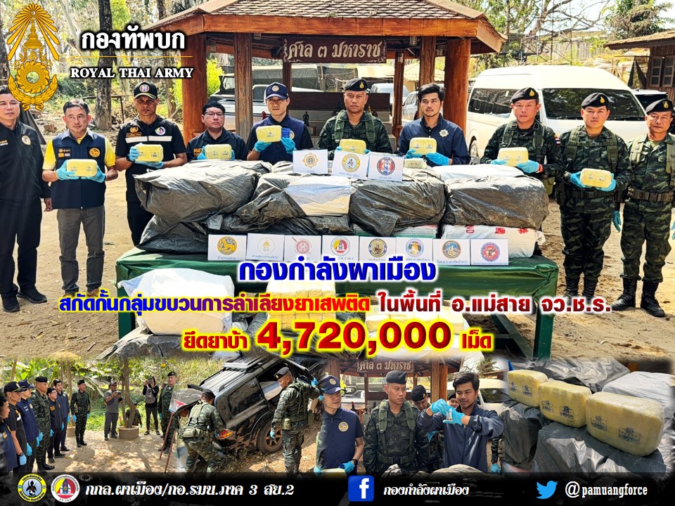 กองกำลังผาเมือง สกัดกั้นกลุ่มขบวนการลักลอบลำเลียงยาเสพติด ยึดยาบ้า จำนวน 4,720,000 เม็ด ในพื้นที่ อำเภอแม่สาย จังหวัดเชียงราย admin9 hours ago 0