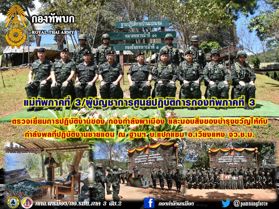 การตรวจเยี่ยมของผู้บังคับบัญชากกล.ผาเมือง ให้การต้อนรับ พล.ท.วรเทพ บุญญะ มทภ.3/ผบ.ศปก.ทภ.3 และคณะ ตรวจเยี่ยมการปฏิบัติงานของกำลังชายแดน ในพื้นที่ ฉก.ไชยานุภาพ กกล.ผาเมือง ณ ฐานปฏิบัติการบ้านแปกแซม อ.เวียงแหง จว.ช.ม. admin5 days ago01 min mins Post navigation Previous: กกล.ผาเมือง สนับสนุนทีมแพทย์ฉุกเฉินแห่งชาติ บินด่วนรับผู้ป่วยวิกฤติในพื้นที่ห่างไกล