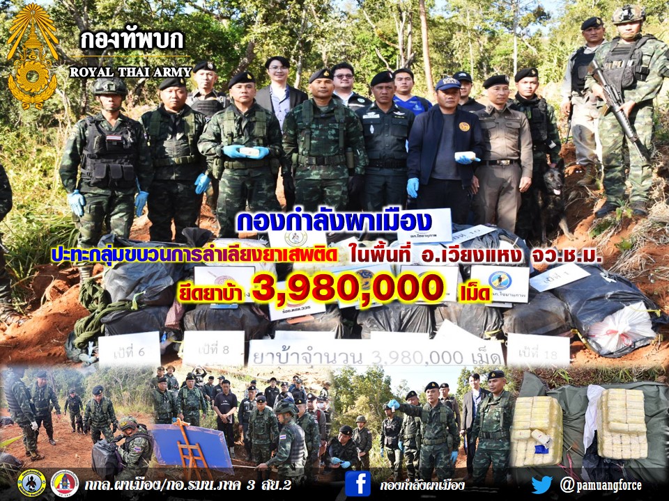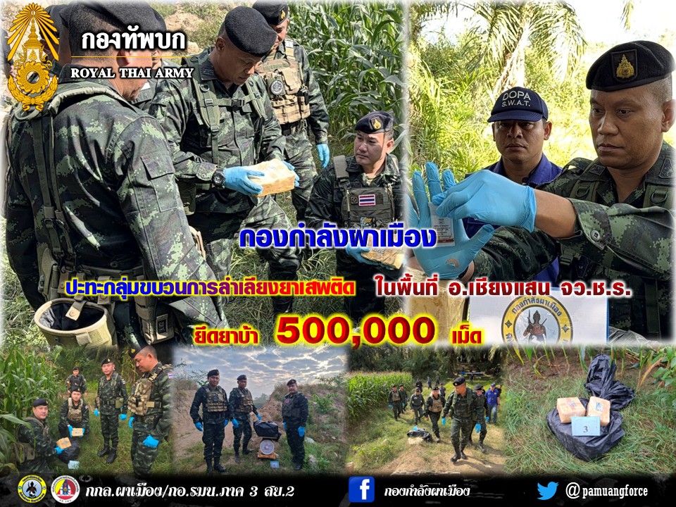 กองกำลังผาเมือง ปะทะกลุ่มขบวนการลักลอบลำเลียงยาเสพติด ยึดยาบ้า 500,000 เม็ด ในพื้นที่ อำเภอเชียงแสน จังหวัดเชียงราย