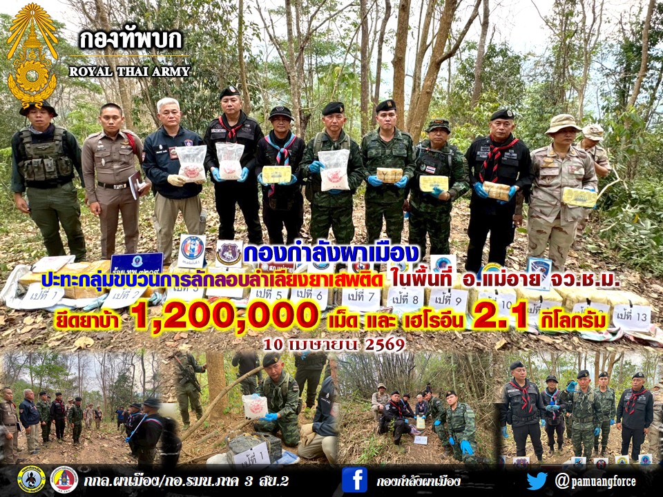 กองกำลังผาเมือง ปะทะกลุ่มขบวนการลักลอบลำเลียงยาเสพติด ยึดยาบ้า 1,200,000 เม็ด และเฮโรอีน 2.1 กิโลกรัม ในพื้นที่ อำเภอแม่อาย จังหวัดเชียงใหม่ admin1 day ago 0