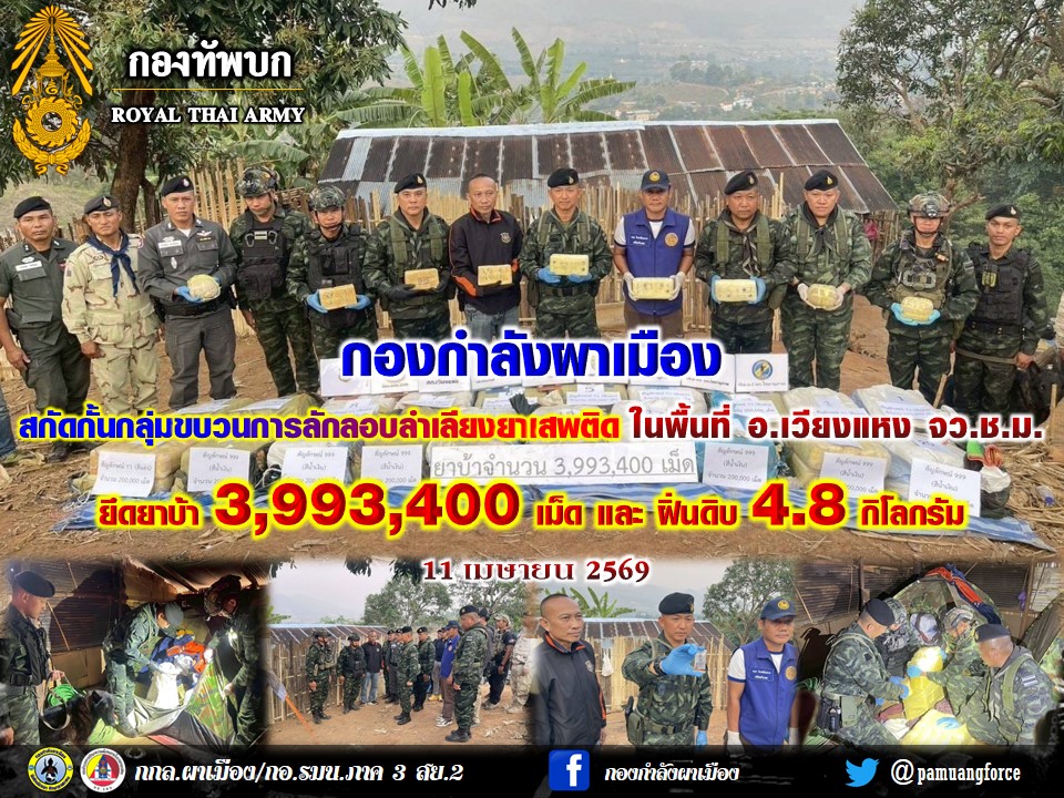กองกำลังผาเมือง สกัดกั้นขบวนการลักลอบลำเลียงยาเสพติด ยึดยาบ้า 3,993,400 เม็ด และ ฝิ่นดิบ 4.8 กิโลกรัม ในพื้นที่ อำเภอเวียงแหง จังหวัดเชียงใหม่ admin1 day ago 0
